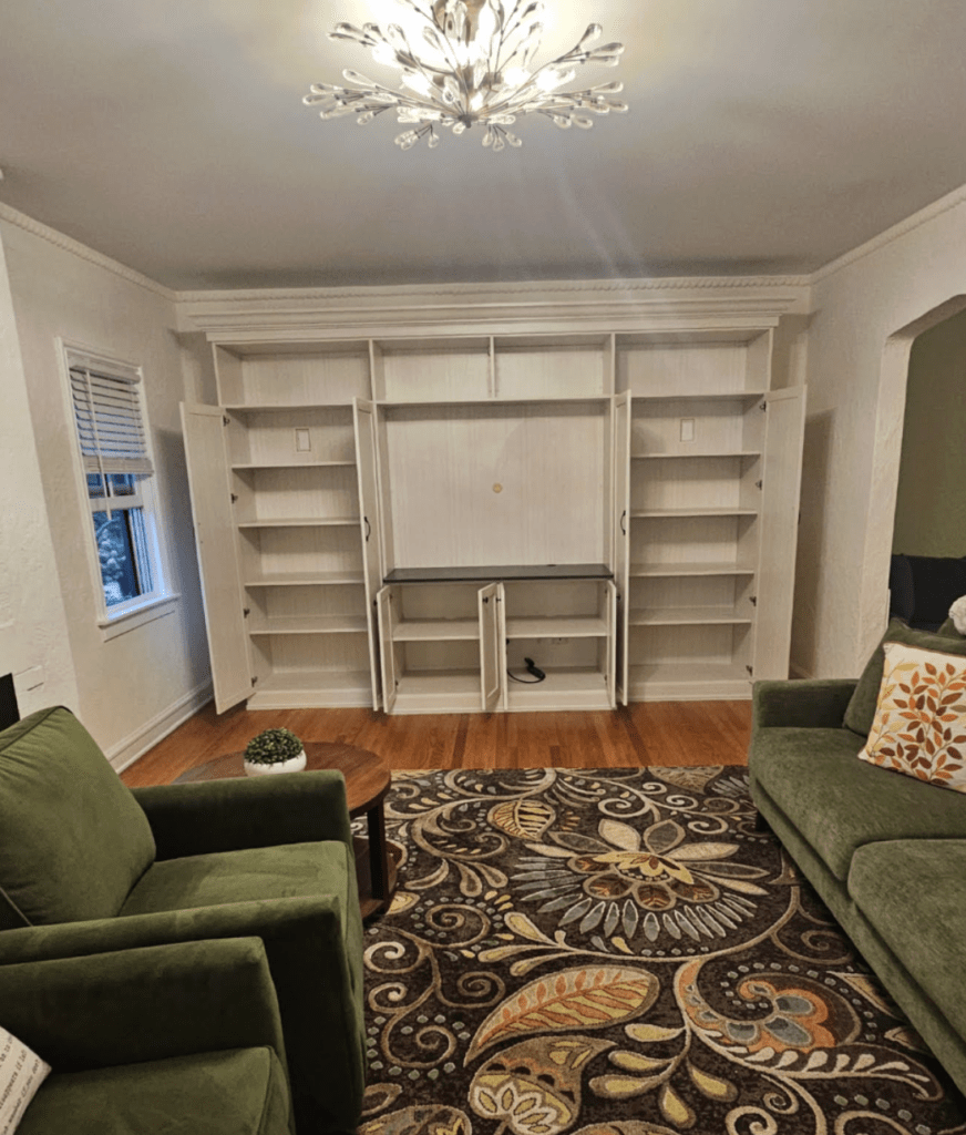 Here’s a recent project that brings storage and style together in one polished entertainment center. The Bella doors and classic White Chocolate finish keep everything organized without stealing attention from the room.